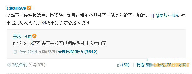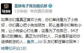 但是就在一切顺风顺水的时候,皇族的核心ADC兼队长Uzi在微博上宣布退出参加今年的S4总决赛,这一爆炸性的新闻诞生的同时,各位业内人士和玩家都在猜测Uzi退赛的原因。