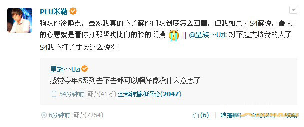 PLU米勒:狗队你冷静点,虽然我真的不了解你们队到底怎么回事,但我如果去S4解说,最大的心愿就是看你打那帮吹比们的脸的啊操